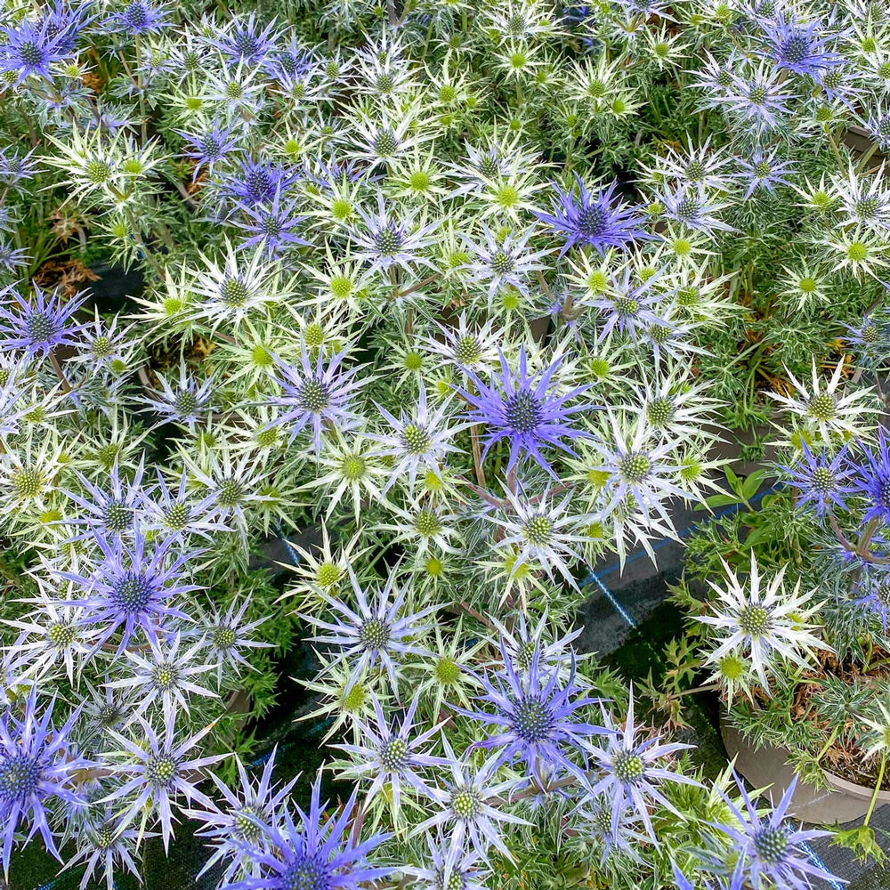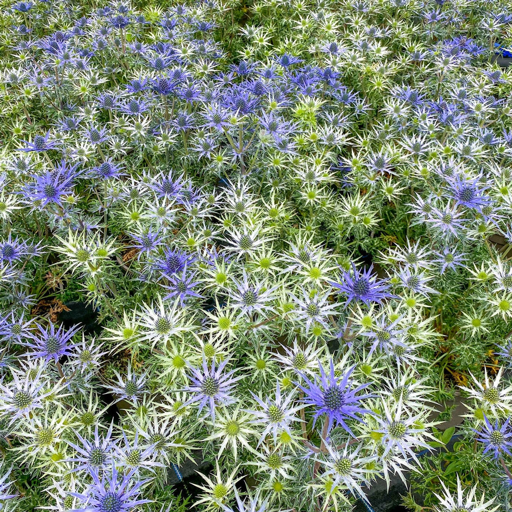 Offer your customers a versatile and colorful perennial that perks up summer sites in no time. Mediterranean Sea Holly is a long-lasting and drought-tolerant plant that produces striking silvery green blooms that change to a unique, steel-blue hue over time. The flowers attract bees and butterflies throughout the long bloom period. Deeply cut foliage adds another layer of interest to borders and garden beds. Plant in full sun for maximum visual impact. Size: #1 Root.