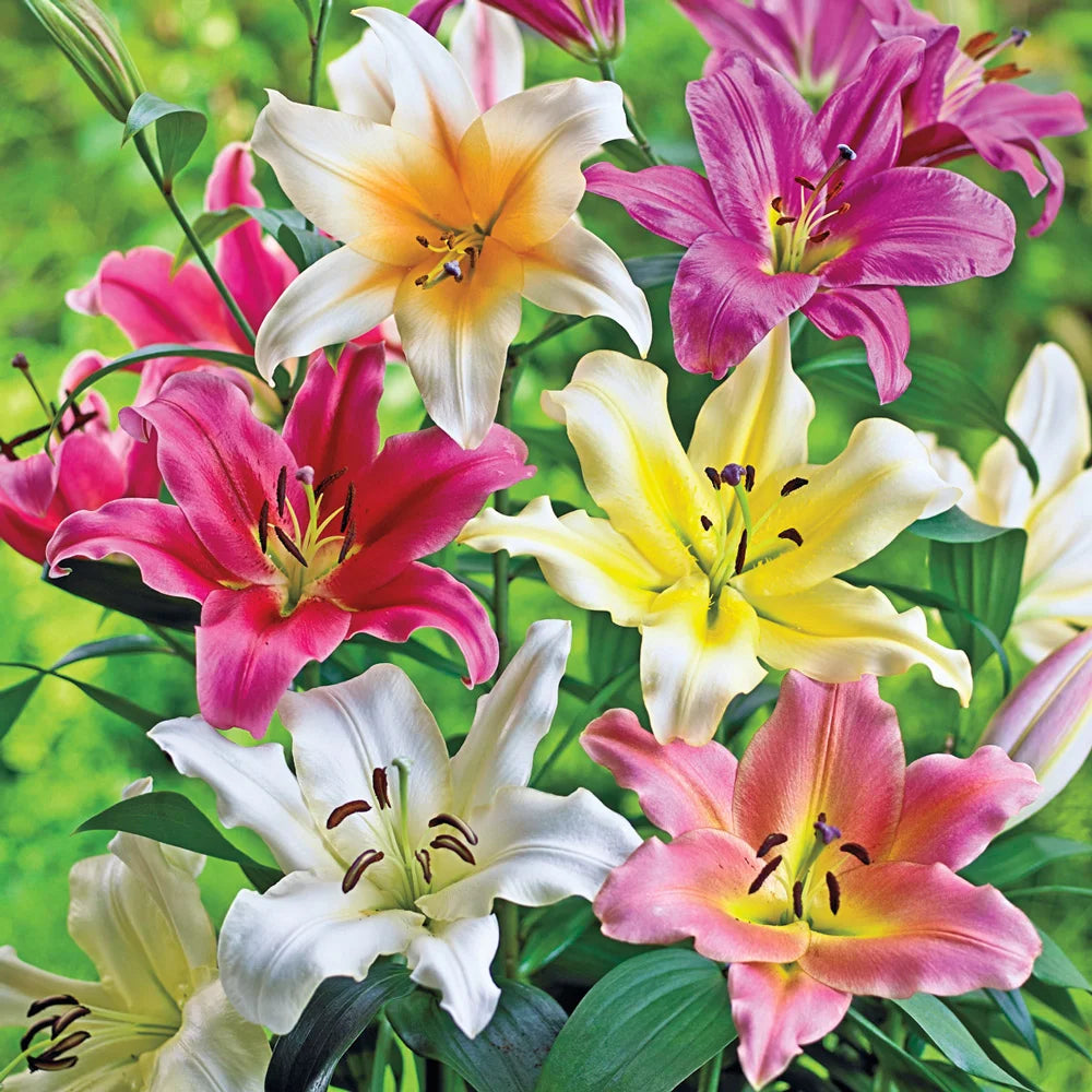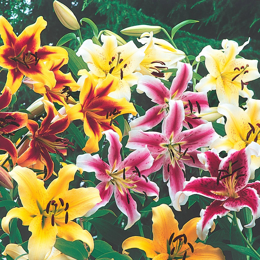 Amazingly large 8-10" flowers in an array of beautiful colors appear in summer to great enthusiasm from gardeners and lily lovers alike. Fragrant blooms in a classic lily form face outward to the delight of passing pollinators and butterflies. The plants are impressive, too, reaching soaring heights within the first year, and up to 8' tall by year three. Planted in a row, the giant lilies create a wonderful flowering privacy screen. In groups, they draw plenty of attention from passersby.