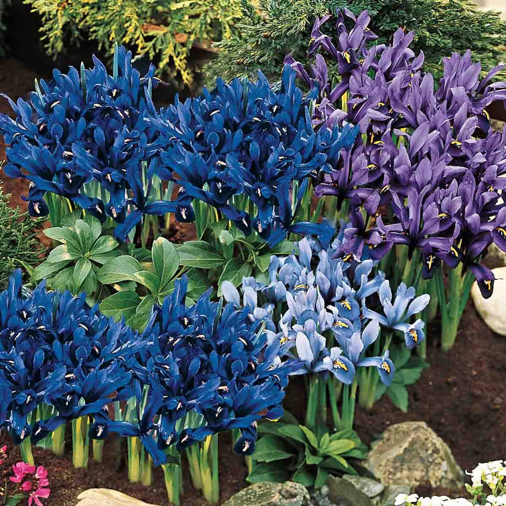 First sign of spring! Plant this colorful mix of dainty dwarf iris reticulata and enjoy its bold shades and charming flower form for weeks from late winter to early spring. Low growing at only 4-6" tall, it is ideal for brightening front borders, creating drifts of vibrant hues, or accenting a waterside bed with color and interest. A fantastic naturalizer, this little iris reliably returns yearly with even more vigor and in greater numbers.