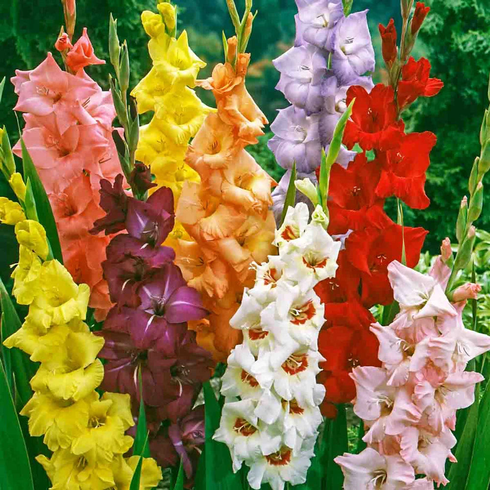 Mixed gladiolus flowers that could include deep red, pink, white, yellow, deep magenta, green, orange and dark purple. Excellent varieties for commercial cut-flower growers. Beautiful and long-lasting colors for floral arrangements, these glads are also ideal for the back of a sunny border where they will rise and shine above lower-growing perennials and annuals.
