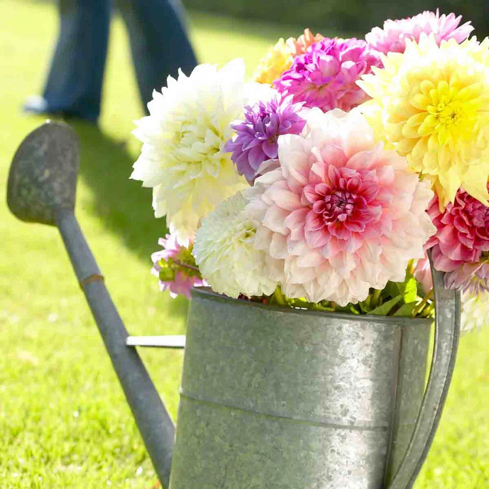 Add a burst of color to your late-summer garden and cut-floral bouquets and arrangements with the Large Decorative Dahlia Mixed. This random mix of decorative dahlias may include white, yellow, pink, purple or red flowers. Growing 32-48" tall, the Mixed Large Decorative Dahlias features large, stunning flowers that are 6-8" across. With their soft-quilled petals and intense colors, they're sure to delight when they start blooming in midsummer and continue until the first frost in fall. Deer tend to pass them by.