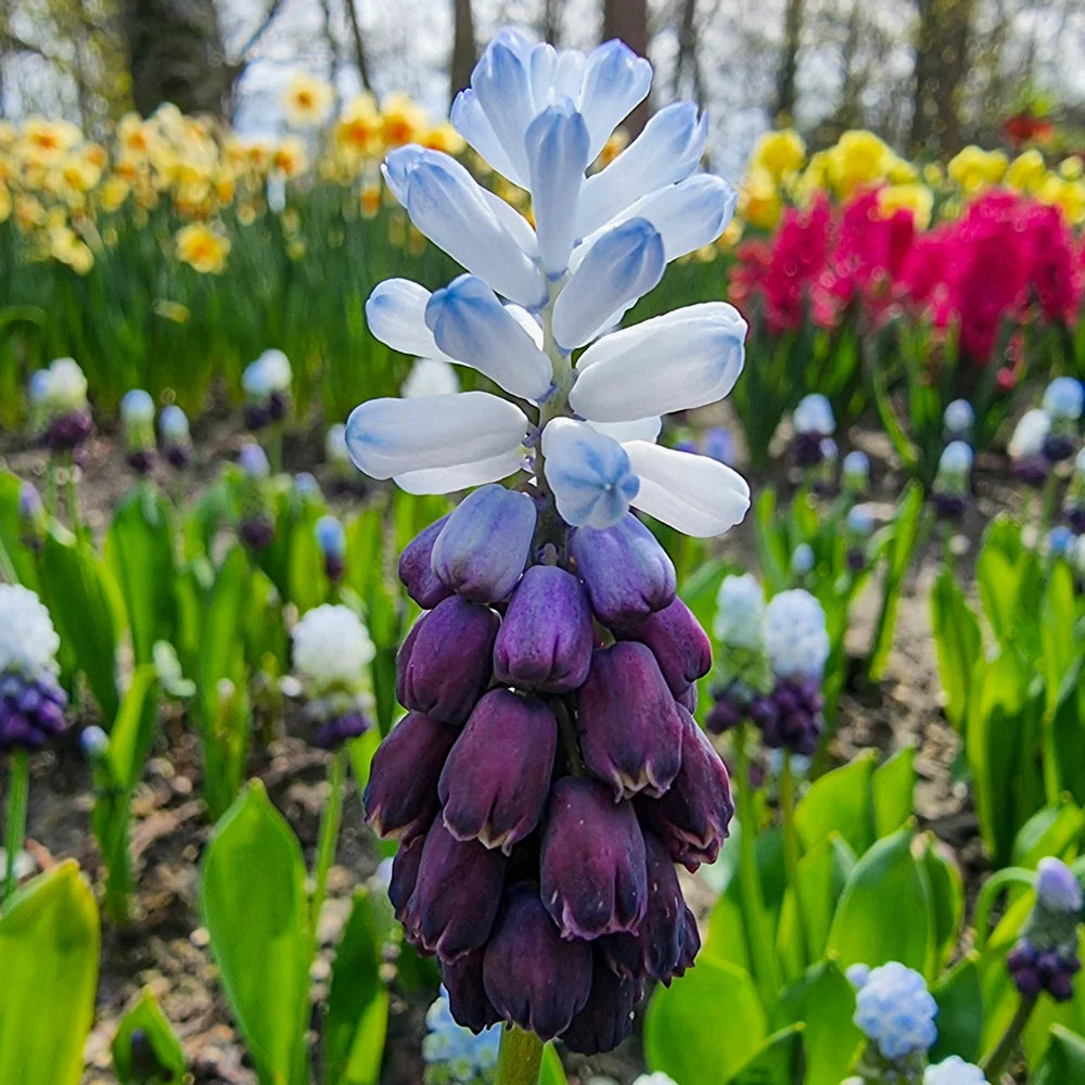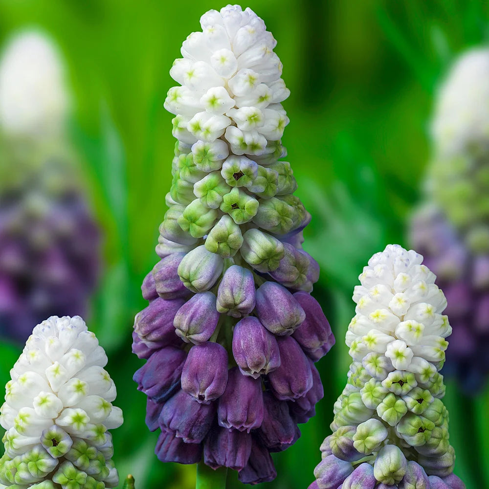 A touch of whimsy is just a bulb away! Muscari Grape Ice is a unique tri-colored variety of grape hyacinth that is sure to become an industry favorite. Each conical, 2" bloom raceme is made up of three distinct color bands-deep Oxford blue at the bottom, green in the middle, and white at the top. Deer and other wildlife pests won't bother with it, but pollinators and butterflies love the fragrant blooms. Perfect for front borders, containers, wooded areas and more!