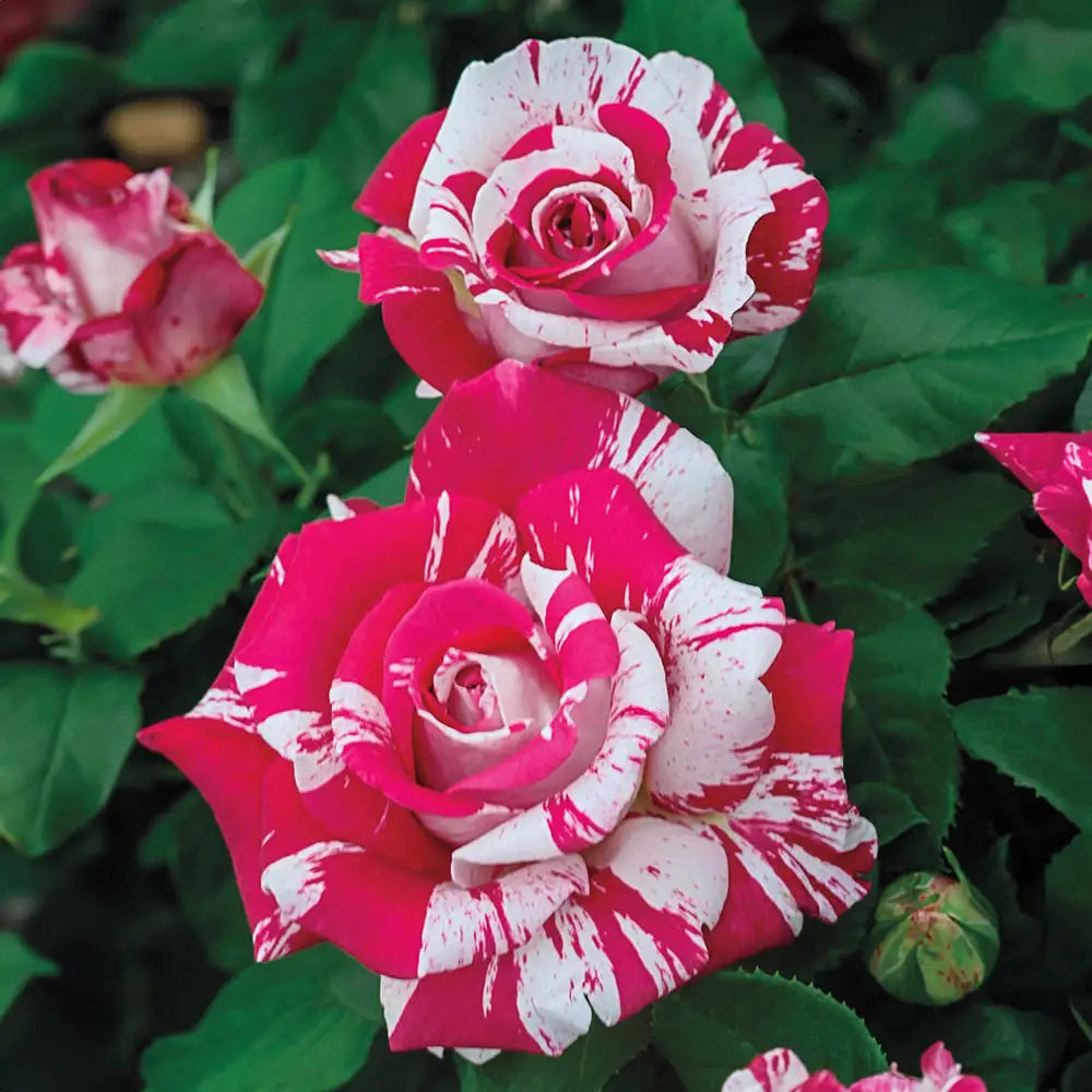 A star in the garden or vase, this show-stopping hybrid tea rose boasts an unusual striped and speckled pattern of diverse pink hues, ranging from deep raspberry to blush white. Named for the consummate showman, Neil Diamond, this beauty offers plenty of style and substance to the landscape and makes garden beds sing. It emits an intense, sweet rose scent, and the plant's upright habit puts the blooms at nose level for better enjoyment. Long, straight stems are ideal for cutting. Resistant to rust and powdery mildew. PP27272