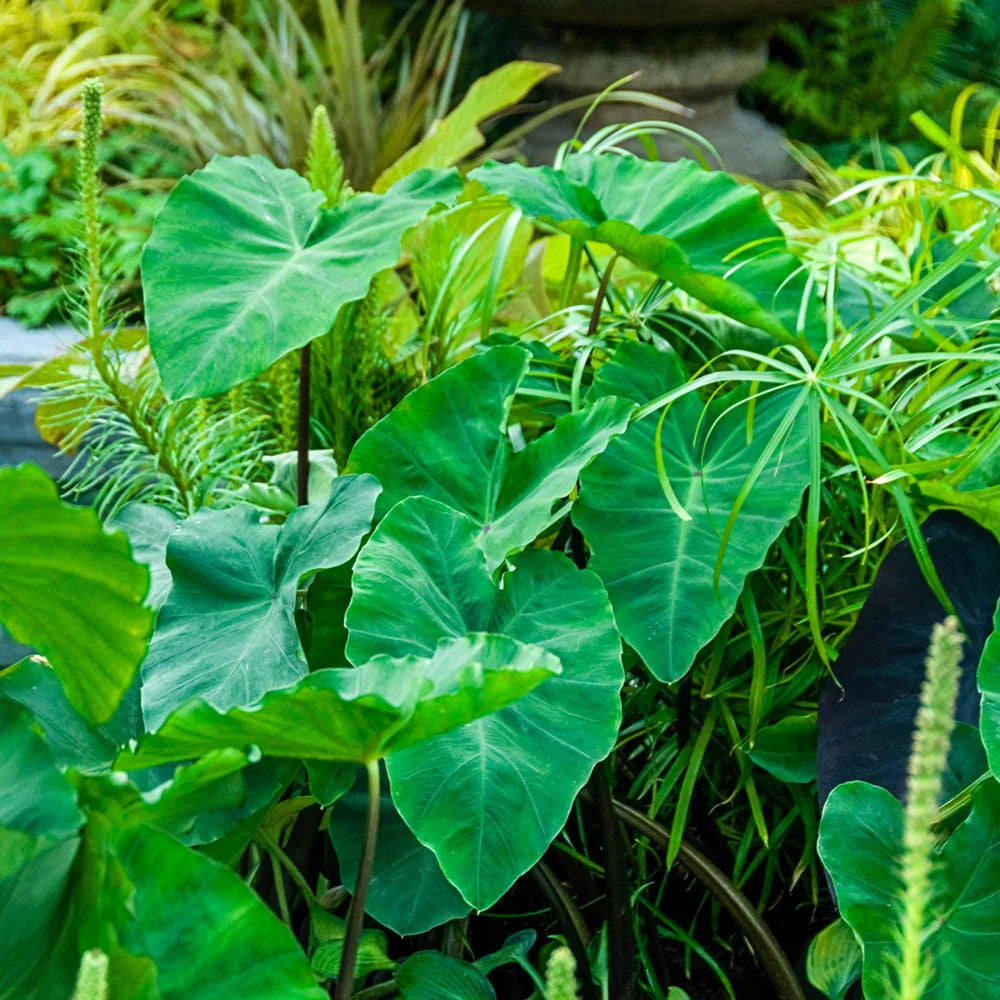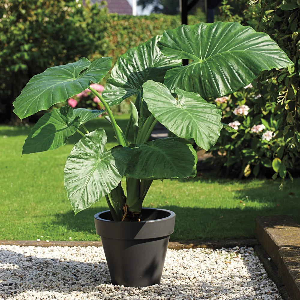 Features large, deep green, upright leaves that will provide a bold, tropical look in a patio container or the summer garden. Growing 4-6' tall, Alocasia Odora is an excellent accent plant and performs best when planted in moist, partially shaded or shaded areas. Also called an Elephant Ear, Alocasia Odera is a tender plant sensitive to the cold. It should be lifted in the fall in zones 3-8 and stored in a cool, dry, frost-free location. Deer tend to pass it by.