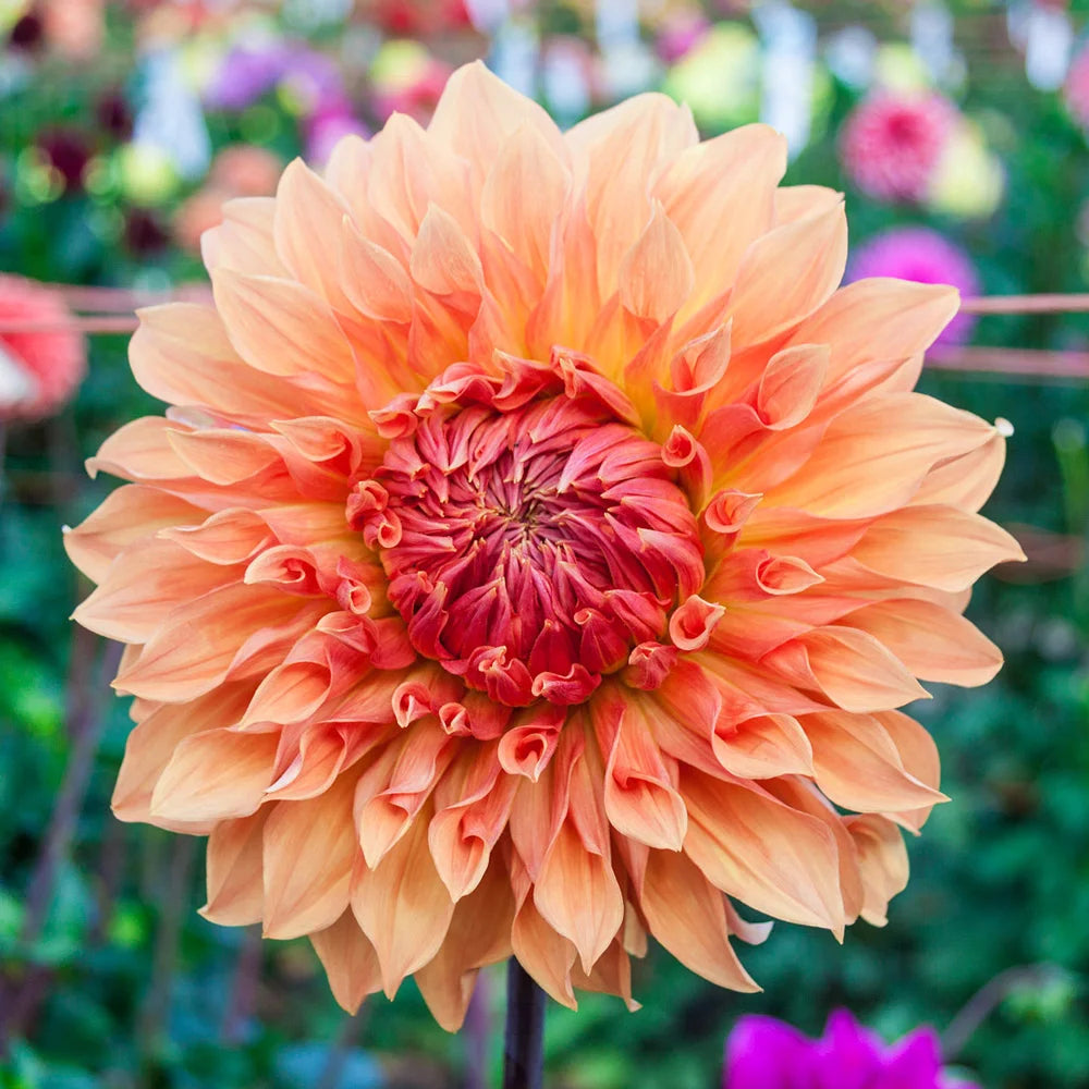 Warm orange tones and stunning flower size make Noordwijks Glory Large Decorative Dahlia one of our favorites! The fully double flowers often reach 6-8" across, and the plants grow 40" tall. With their soft-quilled petals and intense colors, dahlias add a burst of color and life to your late-summer gardens well into the fall. They're eye-catching as cut flowers in bouquets and fresh floral displays, too. Like other dahlias, Noordwijks Glory performs best when planted in full sun and deer tend to pass it by.