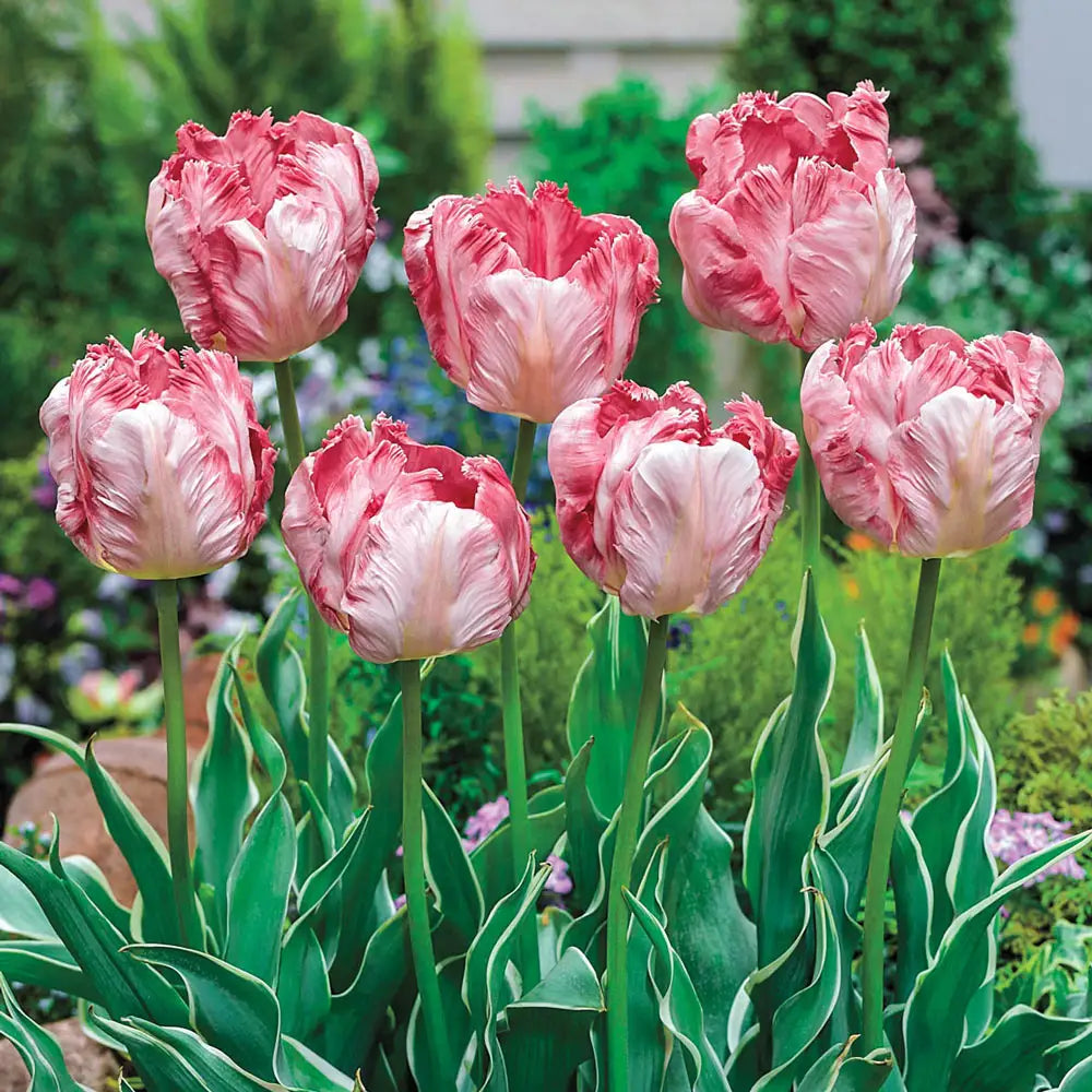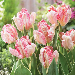 Late-spring garden beds and borders get a punch of color, form and fancy with the addition of this new parrot type tulip. Silver Parrot wows with enormous 8" flowers of subtle rose-pink accented with creamy white edges. Flamboyant ruffles add a sense of celebration to the display, whether in an outdoor planting or indoor arrangement. The overall look is made even more unique by the attractively variegated foliage found beneath the large blooms.