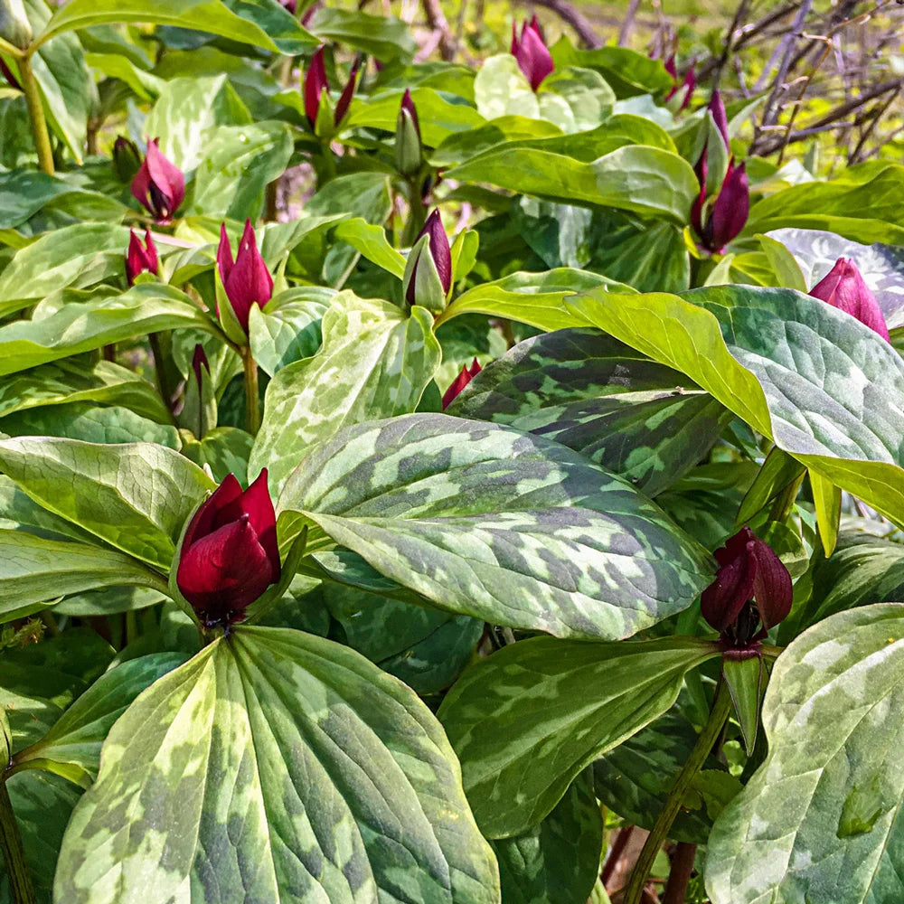 Customers with wooded lots or shady sites love these charming little wildflowers. With their petite, tri-petaled blooms in unique shades of deep purple to brown, Prairie Trillium is the perfect perennial for accenting those often difficult landscapes. Plant this U.S. native in sun-dappled areas where the brightly mottled foliage can easily be admired. Very nice in rock gardens where the delicate blooms contrast with the naturally rugged backdrop. A dependable grower that requires no special care or maintenance to thrive, Trillium recurvatum is often found growing wild along the trails in the country's state parks. Blooms reliably from April to May in zones 4-8. Butterflies love this low-growing beauty.