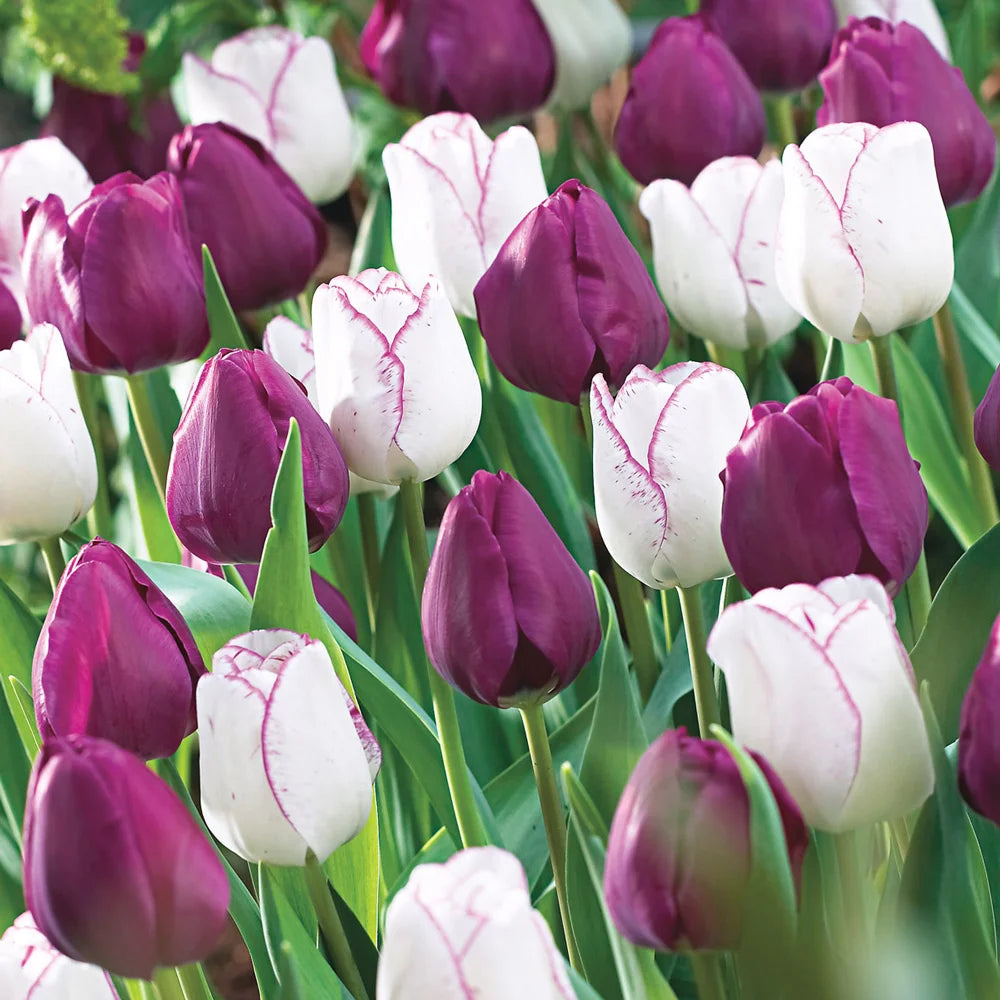 A mix of plum-purple 'Negrita' and white edged with purple 'Shirley', Triumph Tulip Purple Perfection Duo adds a regal look to flower beds, container plantings and cut-flower displays. Triumph tulips are the result of crossing the long-stemmed Darwin Hybrid tulips with the short-stemmed early tulips. When planted outdoors, their flowering time is in between these two varieties, blooming late April through early May. With their strong stems, large flowers and 18-20" height, this tulip duo is excellent as potted plants for Valentine's Day and Easter, and are superb in beds or borders.