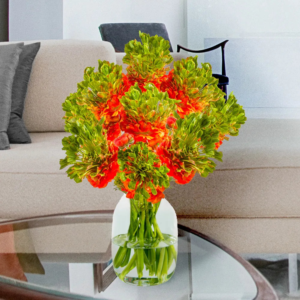 Introducing a ranunculus like no other. Crown Nervion boasts a truly unique flower form and unusual coloration never before seen in this species. Fluffy, orange, double blooms are topped in a crown of spring green that grabs the attention of both pollinators and passersby. At times, you might even spy a bit of purple on the ruffled petals. Standing at a moderate 12-18" tall, the robust plants produce a plethora of blooms, and look great in front borders and cutting beds. Placed in a decorative container, they jazz up any patio, porch or deck. Plant in full sun and rich, well-drained soil for best results.