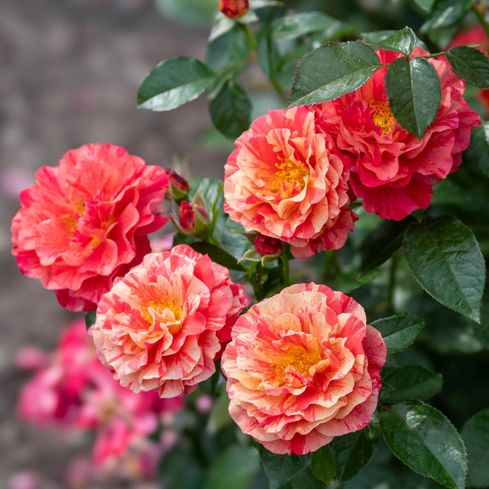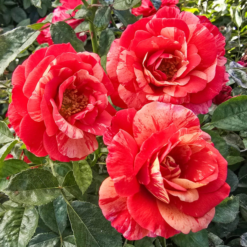 This new floribunda has it all-novel coloring, loads of blooms and great disease resistance. When we saw Frido Kahlo in the test gardens, we loved how the clusters of striped flowers in warm hues of yellow, orange and red stood out against the dark green, full foliage. Adding to its charm is its slight tea fragrance. A vigorous, upright shrub, it has 5-6 flowers per cluster.
