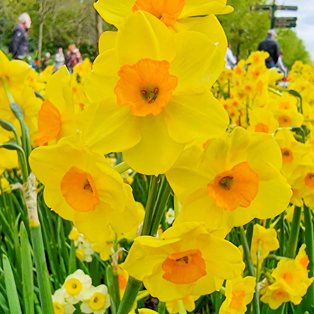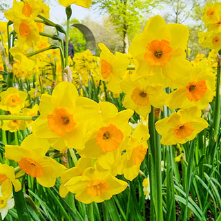 The winner of multiple awards for performance, appearance and resilience, Golden Dawn is a beautiful multi-flowered tazetta-type daffodil that does wonders for mid to late-spring borders and beds. It reliably bears up to 4-5 vivid greenish-yellow blooms with orange cups on each stem. Flowers are strongly fragrant and, as a Southern Performer, do extremely well all the way down to zone 9.