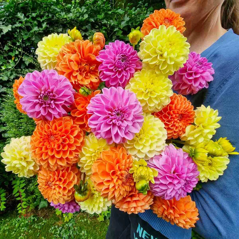 A more cheerful and bright mix hasn’t been seen in some time. Our exclusive new blend of dahlias features 4" double blooms in a trio of summery hues—bright pink, sunny yellow and vibrant orange. The perfect mix to bring a vivid punch of color to summer borders, lasting all the way to the first frosty days of fall. Bring the joy indoors with a fresh-cut bouquet, each bloom topping straight, 28-34" stems. Dahlias are robust, virtually carefree and fast growing.