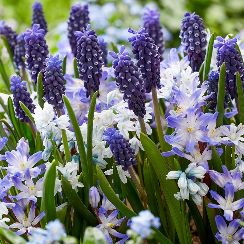 Introducing a beautiful, award-winning mix of blue and white blooms that creates a flowering carpet of color in early-spring landscapes. Puschkinia libanotica has icy white blooms marked with central blue stripes, while Chionodoxa luciculiae shows sky-blue flowers with pure white centers, and Muscari latifolium has bicolor blue blooms for a truly stunning display. Perfect for naturalizing, container gardens and mass planting, Under a Blue Moon Bulb Mix is an all-in-one floral solution.