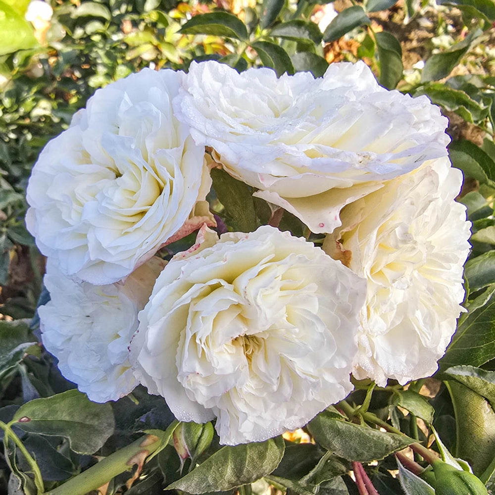 A blizzard of snowy white blooms covers this hardy plant starting in late spring and repeats regularly until frost. Flowers are large compared with other groundcover roses, and very heavily petaled. Glossy, deep green leaves cover the rapidly spreading canes, which can reach five feet long. Makes a beautiful blooming border, a low hedge along property lines, and a great cover-up for views that are best hidden. It's also one of the best for containers, cascading down over the sides.