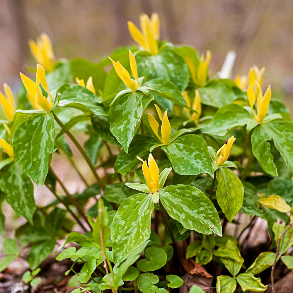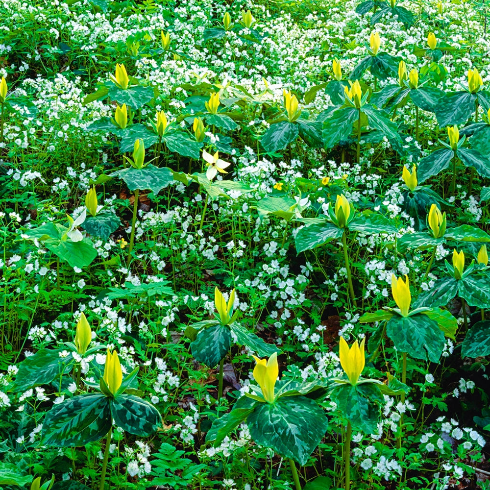 Adding color to shady spaces can sometimes be a challenge, but with this native wildflower the task is an easy one. Yellow Trillium, or Trillium luteum, features sunshine-yellow flowers with three petals amid stylish mottled, mid green leaves. It grows only 6-12" tall, making it a natural for tucking into the space between evergreen shrubs, under deciduous trees or at the front of a darkened border. Perfect for wooded sites and rock gardens. A native wildflower to the U.S., Yellow Trillium can often be found along trails in state parks during the early weeks of spring. Butterflies love this sunny little perennial, too.